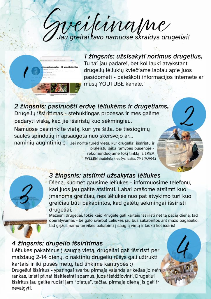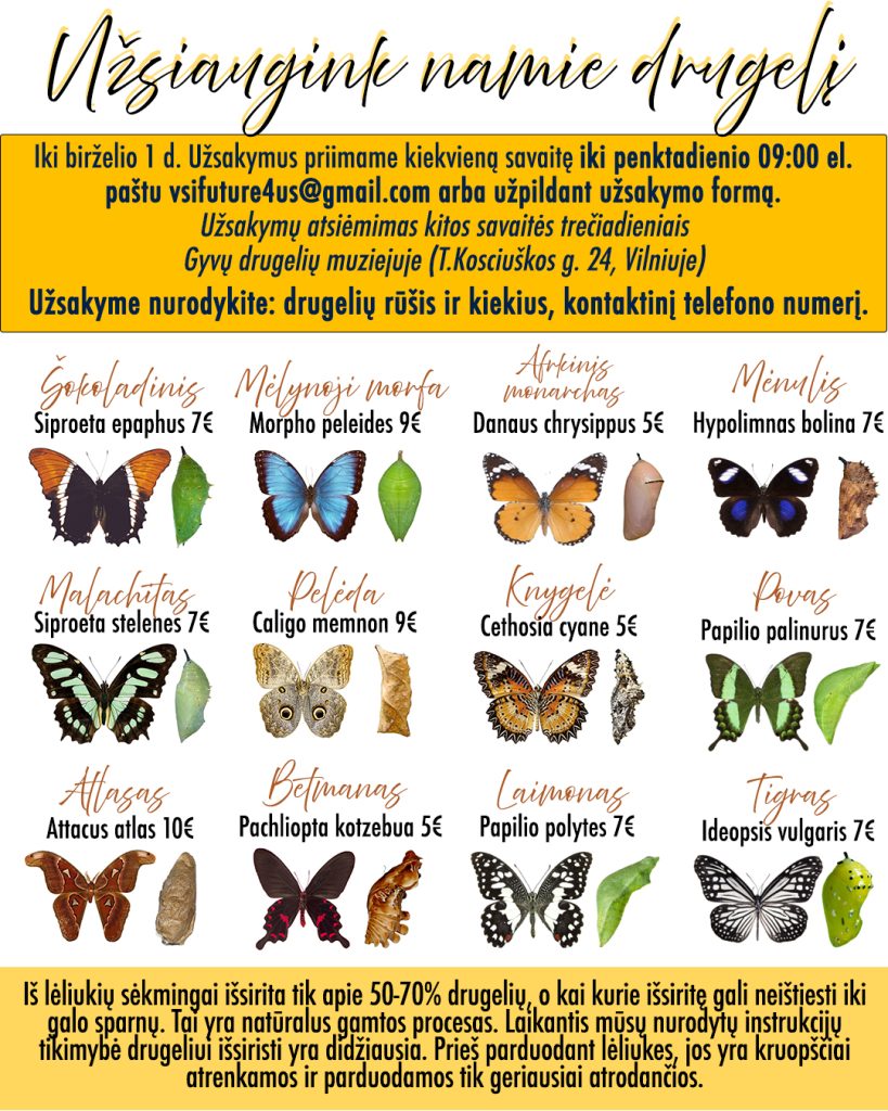 - Atsiėmimas: kitos savaitės trečiadienį Gyvų drugelių muziejuje (T. Kosciuškos g. 24, Vilnius)